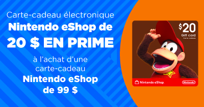 OFFRE VALABLE DU 3 AU 30 MARS 2026, DANS LES CIRCLE K ET LES GO!STORES PARTICIPANTS. CETTE OFFRE PEUT ÊTRE MODIFIÉE EN TOUT TEMPS SANS PRÉAVIS. SELON LA DISPONIBILITÉ, JUSQU’À ÉPUISEMENT DES STOCKS. Pour être admissible à cette promotion, les clients doivent acheter une carte-cadeau Nintendo eShop d’une valeur de 99 $. Avec chaque carte-cadeau achetée, le client peut recevoir une (1) carte-cadeau électronique Nintendo eShop de 20 $ en prime. Pour réclamer le(s) carte(s)-cadeau(x) électronique(s) Nintendo eShop de 20 $, allez à prepaidrewards.ca. Vous devez réclamer votre carte-cadeau électronique de 20 $ en prime au plus tard le 3 avril 2026. Disponible jusqu'à épuisement des stocks de cartes-cadeaux électroniques seulement. Voir le site Web et/ou les cartes-cadeaux pour plus de détails et les conditions. Toutes les marques déposées sont la propriété de leurs propriétaires respectifs. Nintendo n'est ni sponsor, ni co-sponsor, ni administrateur de cette promotion. © Nintendo